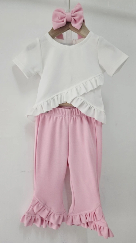 Deze prachtige 3-delige baby en peuter meisjes set met ruffles is perfect voor een stijlvolle en comfortabele outfit! De set bestaat uit een top met schattige ruffle details, een bijpassende flared broek met aan de onderkant super leuke sierlijke ruffles en een mooie haarband met een strik die de outfit helemaal compleet maakt!