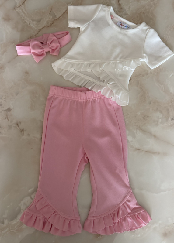 Baby meisjes 3 delige set met ruffles "Roze"Comfortabele, Stijlvolle en Schattige kledingsetje voor je kleine meidDeze prachtige 3-delige baby en peuter meisjes set met ruffles is perfect voor een stijlvolle en comfortabele outfit! De set bestaat uit een top met schattige…